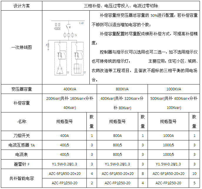1、變壓器容量為400/800/1000/1250/1600/2000KVA的三相補(bǔ)償應(yīng)用方案。