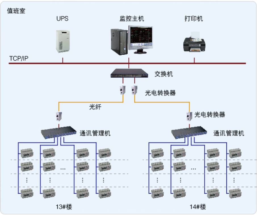 該項目有兩棟樓,均為六層,一共有532個房間,其中13#棟彝學(xué)院289個房間,14#棟藏學(xué)院243個房間,采用我司ADF100單相多用戶電能表195個,分為24條RS485總線接至通訊管理機,通訊管理機通過光纖拉至值班室連接到Acrel-3000預(yù)付費電能管理系統(tǒng)后臺,實現(xiàn)總線上儀表與監(jiān)控主機的數(shù)據(jù)連通。該系統(tǒng)為學(xué)校宿舍項目解決用電問題提供了真實可靠的依據(jù),取得了較好的管理水平。
