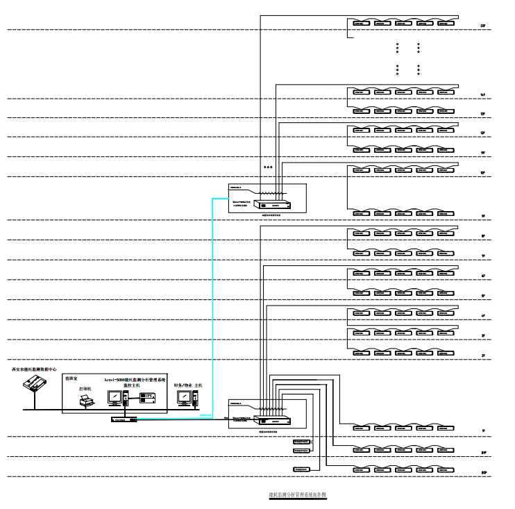 辦公主樓地上二十二層,地下兩層,合計102塊西安旌旗電子的直接接入型電能表,6塊安科瑞電氣的PZ96L-E4電能表,32塊安科瑞電氣的PZ72L-E4電能表,1塊RS485接口Modbus通訊協(xié)議的水表需要進行能耗監(jiān)測。后臺位于一層的值班室內(nèi),因此針對本項目的性質(zhì),設計一套能耗系統(tǒng),并在值班室內(nèi)操作臺處配置一臺通訊管理機,對地下配電室的安科瑞電表、遠傳水表以及裙樓及辦公樓低層的西安旌旗電子電能表進行采集。同時在9層弱電間再設置一臺內(nèi)置通訊管理機的數(shù)據(jù)采集箱,對高層部分的西安旌旗電子電能表進行采集,從9層采集箱至1層值班室操作臺處后臺主機通過光纖進行數(shù)據(jù)傳輸。電表及水表的數(shù)據(jù)采集后按照能耗分類分項原則進行分析,同時根據(jù)西安市公共建筑能耗監(jiān)測系統(tǒng)技術規(guī)范DBJ61/T 97-2015將數(shù)據(jù)上傳至西安市公共建筑能耗監(jiān)測平臺。