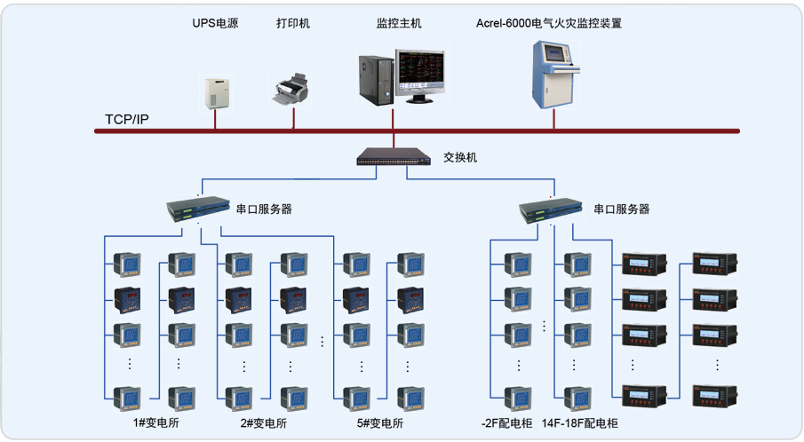 Acrel-6000電氣火災(zāi)監(jiān)控系統(tǒng)是安科瑞電氣股份有限公司自主研發(fā)的用于接收剩余電流式電氣火災(zāi)探測器等現(xiàn)場設(shè)備信號,以實現(xiàn)對被保護(hù)電氣線路的報警、監(jiān)視、控制、管理的運行于計算機的工業(yè)級硬件/軟件系統(tǒng)。本系統(tǒng)應(yīng)用于大型商場、生活小區(qū)、生產(chǎn)基礎(chǔ)、辦公大樓、商場酒店等區(qū)域的消防控制中心,對分散在建筑內(nèi)的探測器進(jìn)行遙測、遙調(diào)、遙控、遙信,方便實現(xiàn)監(jiān)控與管理。本系統(tǒng)采用標(biāo)準(zhǔn)的Modbus現(xiàn)場總線將具有通信功能的探測器相互連接起來,當(dāng)現(xiàn)場保護(hù)線路中的被探測參數(shù)超過報警設(shè)定值時,能發(fā)出報警信號、控制信號,能指示報警部位并保存報警信息。