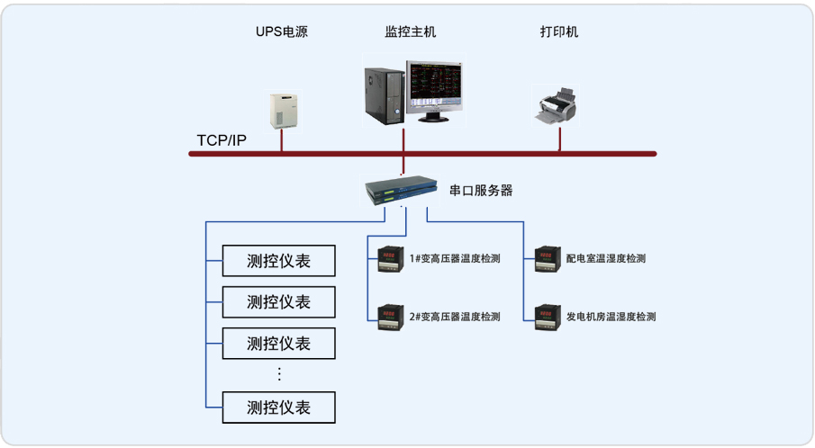 系統(tǒng)主要實(shí)現(xiàn)中國(guó)建設(shè)銀行股份有限公司云南分行本部地下B2變電所的0.4kV配電系統(tǒng)進(jìn)行用電監(jiān)測(cè)與電能管理;監(jiān)測(cè)范圍為改造變電所的T1、T2變壓器的饋線柜、母聯(lián)柜、電容補(bǔ)償柜,變壓器的相間溫度、配電室和發(fā)電機(jī)房的溫濕度,饋線柜和母聯(lián)柜側(cè)儀表進(jìn)行遠(yuǎn)程實(shí)時(shí)監(jiān)控和電能管理。該系統(tǒng)總計(jì)有29只儀表,分4條總線,都是直接通過(guò)屏蔽雙絞線走管道拉至值班室后連接到串口服務(wù)器上,實(shí)現(xiàn)總線上儀表與監(jiān)控主機(jī)的數(shù)據(jù)連通。
