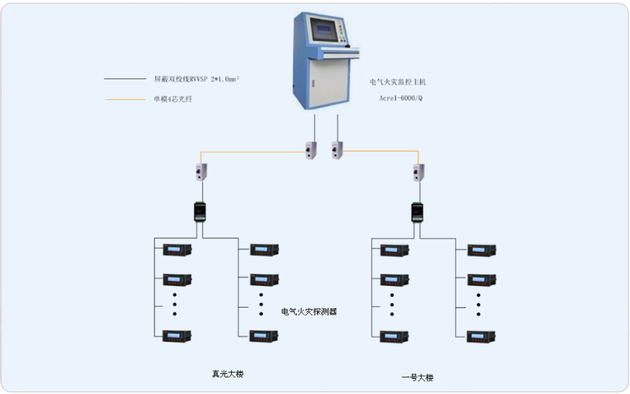 本期工程的監(jiān)控范圍主要為真光廣學(xué)大樓及新建一號(hào)樓,新建一號(hào)樓47個(gè)漏電流監(jiān)控裝置分布在B1~8F中,真光大樓33個(gè)漏電流監(jiān)控裝置分布在B1F~9F中,現(xiàn)為本項(xiàng)目設(shè)計(jì)一套Acrel-6000電氣火災(zāi)監(jiān)控系統(tǒng),監(jiān)控裝置通過集線器及光纖至電氣火災(zāi)監(jiān)控裝置,并由此來實(shí)時(shí)監(jiān)測商業(yè)樓內(nèi)重要回路的漏電流,以確保商業(yè)區(qū)配電系統(tǒng)的電氣安全。
