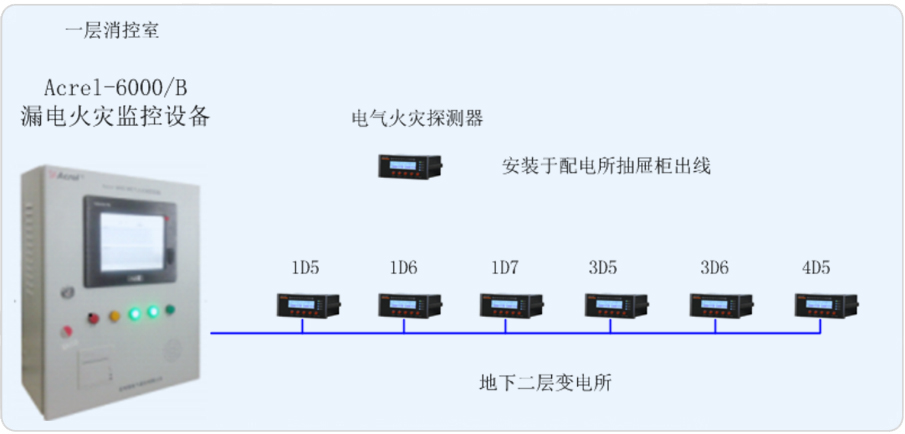 交通飯店有一個變電所,位于地下二層。變電所負責(zé)負一層超市以及地上樓層部分的用電?,F(xiàn)為本項目設(shè)計一套漏電火災(zāi)系統(tǒng),由此來實時監(jiān)測變電所內(nèi)重要回路的漏電流,以確保變電所配電系統(tǒng)的電氣安全。