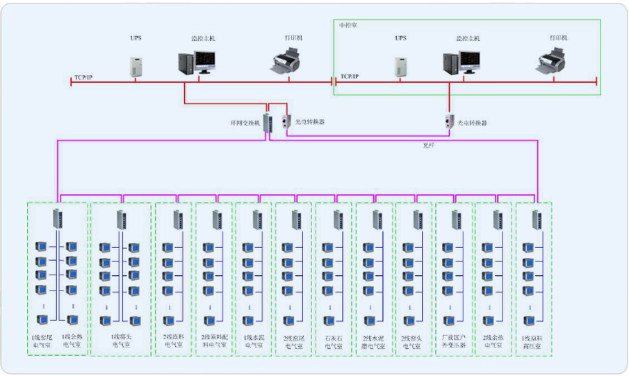 中材萍鄉(xiāng)水泥有限公司廠區(qū)重點(diǎn)用電回路分別分布于1線原料高壓室、1線窯尾電氣室、1線窯頭電器室、2線原料電器室、2線原料配料電氣室、1線水泥電氣室、2線窯尾電氣室、石灰石電氣室、2線水泥磨電氣室、2線窯頭電氣室、廠前區(qū)戶外變壓器、1線余熱電氣室以及2線余熱電氣室等共計(jì)13個(gè)電器室內(nèi)。