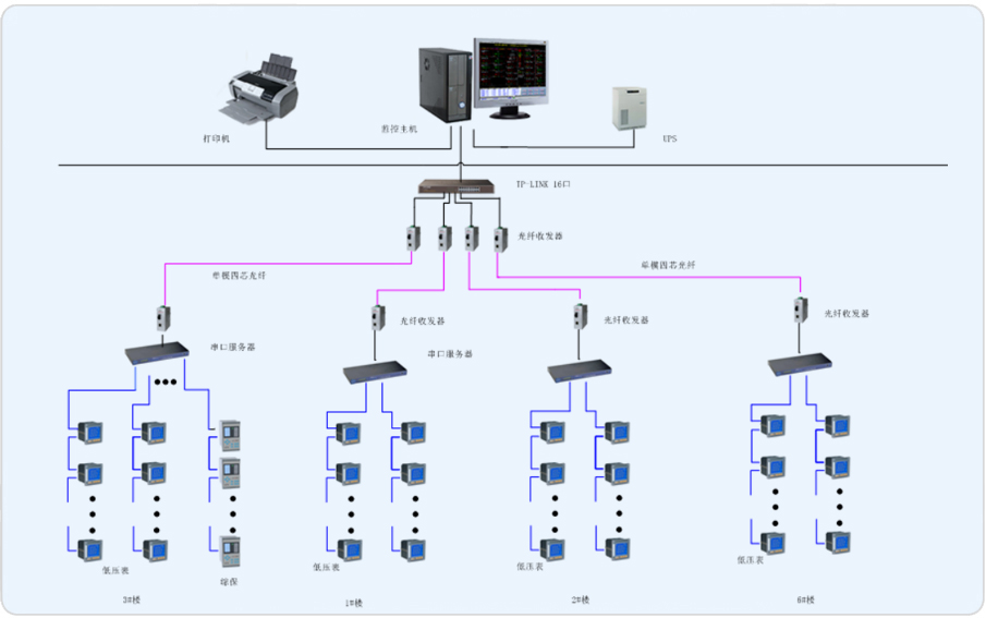 本次項目為制造工程技術(shù)大樓的電力監(jiān)控系統(tǒng)。通過利用原本已安裝的智能儀表,將原非智能儀表更換為智能儀表。通過組建系統(tǒng)網(wǎng)絡(luò),實(shí)時監(jiān)測變電所內(nèi)各個回路的電流、電壓、功率、開關(guān)狀態(tài)等電參量,由此達(dá)到變電所少人值守或無人值守的智能化管理。