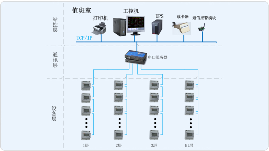 本系統(tǒng)主要實(shí)現(xiàn)對(duì)匯京國際廣場(chǎng)進(jìn)行用電監(jiān)控與電能管理。監(jiān)控范圍為樓層DTSY1352-C商戶預(yù)付費(fèi)儀表65塊,總線直接接入B1層值班室內(nèi)串口服務(wù)器,從而在監(jiān)控主機(jī)上實(shí)現(xiàn)總線上儀表與監(jiān)控主機(jī)的數(shù)據(jù)連通。通過使用Acrel-3000智能預(yù)付費(fèi)管理系統(tǒng)解決了由于商戶較多,管理不方便的問題,這樣既管理方便、又節(jié)省人力,大大減少了物業(yè)的投入。