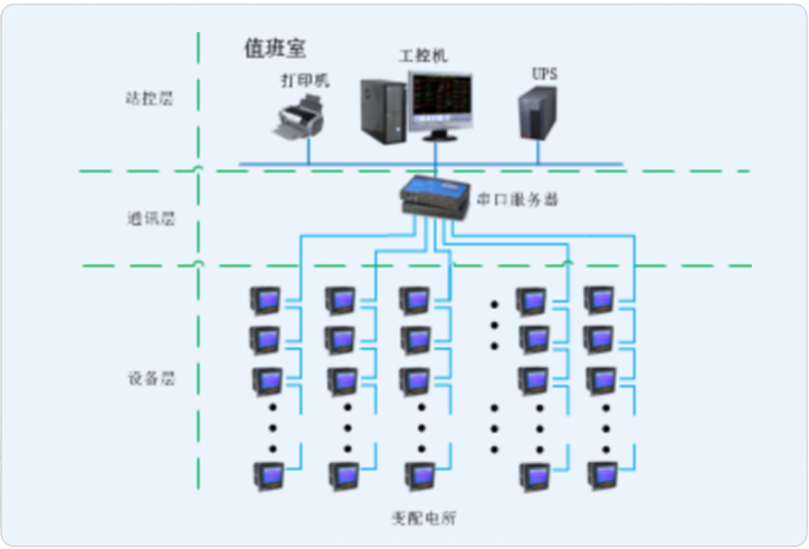 本項(xiàng)目設(shè)計(jì)為變配電所部分電力監(jiān)控系統(tǒng),變配電所位于地下一層,其中有兩路高壓進(jìn)線,配有綜合保護(hù)裝置,低壓部分,進(jìn)線柜、饋線柜配有儀表,本電力監(jiān)控系統(tǒng)監(jiān)控范圍為低壓部分裝置。通過(guò)組建系統(tǒng)網(wǎng)絡(luò),電力儀表通過(guò)現(xiàn)場(chǎng)總線直接接入變電所內(nèi)采集設(shè)備,并將數(shù)據(jù)上傳至Acrel-2000電力監(jiān)控系統(tǒng),實(shí)時(shí)監(jiān)測(cè)變電所內(nèi)各個(gè)回路的電流、電壓、功率、開(kāi)關(guān)狀態(tài)等電參量,由此達(dá)到變電所少人值守或無(wú)人值守的智能化管理。