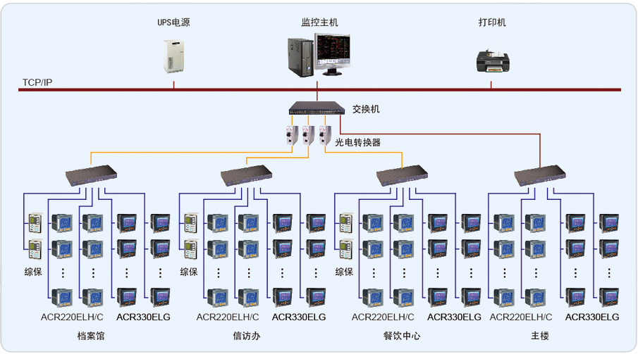該項目采用Acrel-2000電力監(jiān)控系統(tǒng)實現(xiàn)了海門行政中心4座樓內(nèi)(主 樓、A樓、B樓、H樓)電力系統(tǒng)的智能管理。項目值班室位于主樓負一層變配電室內(nèi),主樓變配電室主要設(shè)備是:ACR220EL/KC、ACR330EL/KC可編程智能電測表共96塊,配置一臺工業(yè)網(wǎng)絡(luò)交換機;A樓變配電室主要設(shè)備是:ACR220EL/KC可編程智能電測表共63塊,現(xiàn)場采用8根總線,使用一臺8口的串口服務(wù)器,通過光纖連接至主樓值班室內(nèi)的交換機上;B樓變配電室主要設(shè)備是:ACR220EL/KC可編程智能電測表共59塊,現(xiàn)場采用6根總線,使用一臺8口的串口服務(wù)器,通過光纖連接至主樓值班室內(nèi)的交換機上;H樓變配電室主要設(shè)備是:ACR220EL/KC可編程智能電測表共105塊,采用5根總線,使用一臺8口的串口服務(wù)器,通過光纖連接至主樓值班室內(nèi)的交換機上;再通過交換機把數(shù)據(jù)傳輸?shù)焦た貦C。上述設(shè)備均相互獨立完成各自的功能,不依賴主控計算機運行,具備RS-485 通信接口,通過現(xiàn)場的RS-485總線將檢測到的各項電參數(shù)和狀態(tài)信號實時傳輸?shù)街虚g層的數(shù)據(jù)處理單元—串口服務(wù)器。