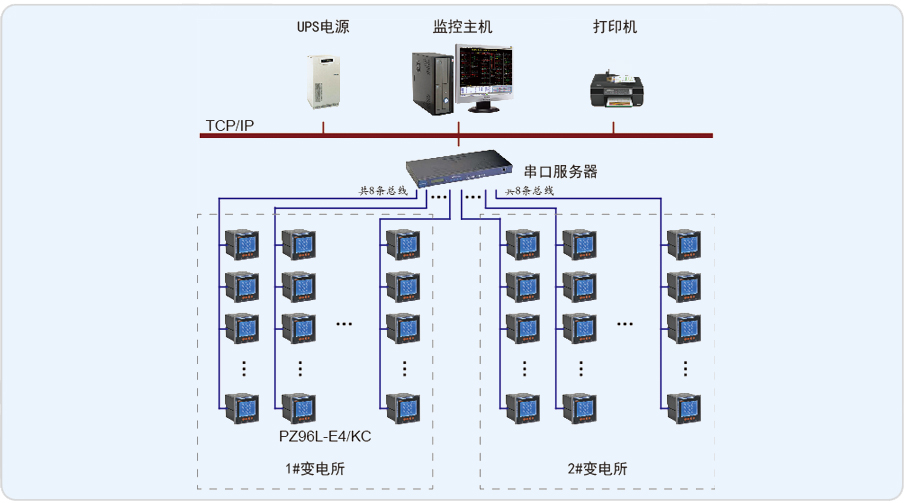 系統(tǒng)組網(wǎng)采用常見的3層結(jié)構(gòu),站控管理層、通訊管理層和現(xiàn)場(chǎng)設(shè)備層。上位機(jī)軟件采用Acrel – 2000電力監(jiān)控軟件,通過軟件進(jìn)行設(shè)備配置、數(shù)據(jù)庫(kù)變量配置、界面設(shè)計(jì)等,完成了在上位機(jī)軟件監(jiān)控及電力監(jiān)控的功能。具體如下: