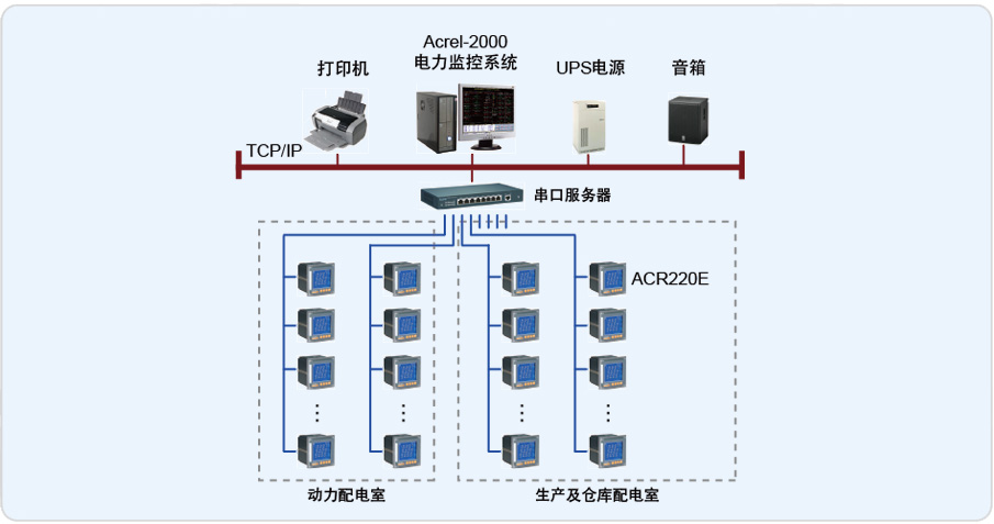 安科瑞電氣股份有限公司于2013年3月承接了杭州賽諾菲民生健康藥電力監(jiān)控系統(tǒng)項(xiàng)目。整個(gè)系統(tǒng)采用Acrel-2000型電力監(jiān)控系統(tǒng),完成了杭州賽諾菲民生健康藥業(yè)有限公司共有2個(gè)配電室(動(dòng)力中心配電室、生產(chǎn)廠房及倉庫配電室)電力監(jiān)控。動(dòng)力中心配電室內(nèi)有2臺(tái)進(jìn)線柜、1臺(tái)母聯(lián)柜、4臺(tái)補(bǔ)償柜及24路普通饋線回路;生產(chǎn)及倉庫配電室內(nèi)有2臺(tái)進(jìn)線柜、1臺(tái)母聯(lián)柜、4臺(tái)補(bǔ)償柜及43路普通饋線回路,整個(gè)監(jiān)控范圍為81個(gè)回路的電參量監(jiān)測,每個(gè)回路均采用安科瑞ACR220E型多功能儀表。網(wǎng)絡(luò)儀表均采用RS485接口和MODBUS-RTU通訊協(xié)議,RS485采用屏蔽線傳輸,上傳至監(jiān)控主機(jī)。