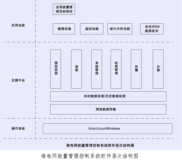 微電網(wǎng)能量管理控制系統(tǒng)軟件體系結(jié)構(gòu)由操作系統(tǒng)、支撐平臺、應(yīng)用功能共三個(gè)層次組成,應(yīng)用功能又分為基本應(yīng)用功能和高級管理功能兩個(gè)部分,如下圖所示。操作系統(tǒng)支持跨平臺,支撐平臺包含數(shù)據(jù)采集管理、數(shù)據(jù)庫管理、網(wǎng)絡(luò)通信管理、圖形管理、報(bào)表管理、權(quán)限管理、報(bào)警管理、計(jì)算統(tǒng)計(jì)等模塊?;緫?yīng)用功能包括SCADA處理、監(jiān)控功能、統(tǒng)計(jì)分析功能、安全WEB數(shù)據(jù)發(fā)布等。高級管理功能包括全局能量管理目標(biāo)制定等。