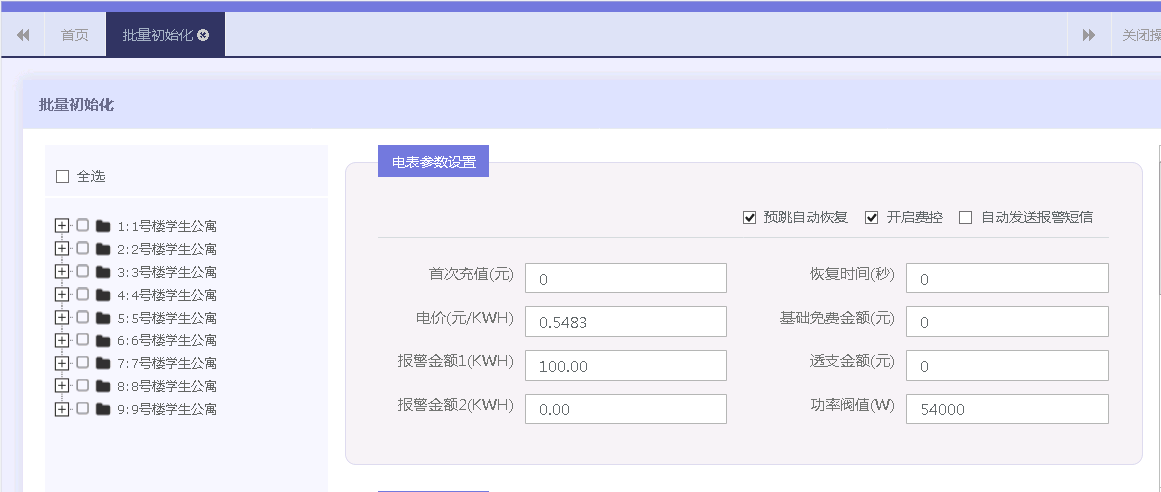 新生入學(xué)后為方便學(xué)校統(tǒng)計不受上屆學(xué)生使用影響,需要對宿舍電表進(jìn)行初始化,設(shè)置電表初始金額、電價、補(bǔ)助金額、報警金額、透支金額等,支持批量設(shè)置。