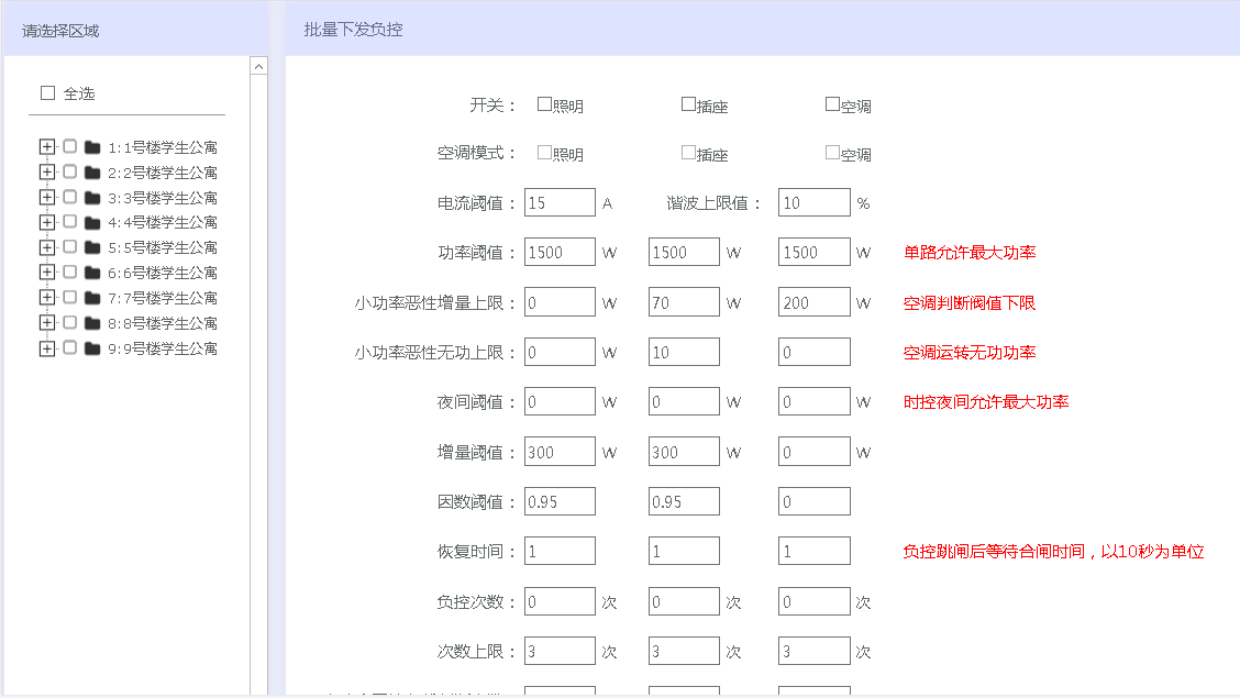 限制學(xué)生使用違章電器,當(dāng)接入未經(jīng)允許的違章電器時,支路跳閘??照{(diào)模式:空調(diào)模式下,電表持續(xù)檢測空調(diào)微弱待機(jī)電流,一但存在拔斷空調(diào)插座的動作,電表便跳閘,且只能通過聯(lián)系管理人員進(jìn)行合閘送電。允許除空調(diào)模式以外的跳閘動作自動合閘。允許次數(shù),跳閘等待時間可設(shè)置,支持批量設(shè)置。