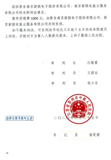 近日安科瑞收到江蘇省蘇州市中級人民法院(以下簡稱“蘇州中院”)的《民事判決書》((2018)蘇 05 民初 1000 號),就原告南京新聯(lián)電子股份有限公司、南京新聯(lián)電能云服務有限公司(以下簡稱“新聯(lián)公司”)與被告安科瑞電氣股份有限公司、江蘇安科瑞電器制造有限公司(以下簡稱“安科瑞”)侵害發(fā)明專利權糾紛一案作出判決。