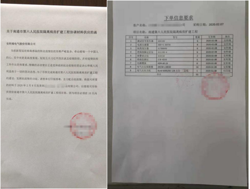 2月7日,安科瑞接到南通市第六人民醫(yī)院隔離病房擴建工程協(xié)調(diào)材料供應(yīng)函,要求在2月8日下午貨到南通。