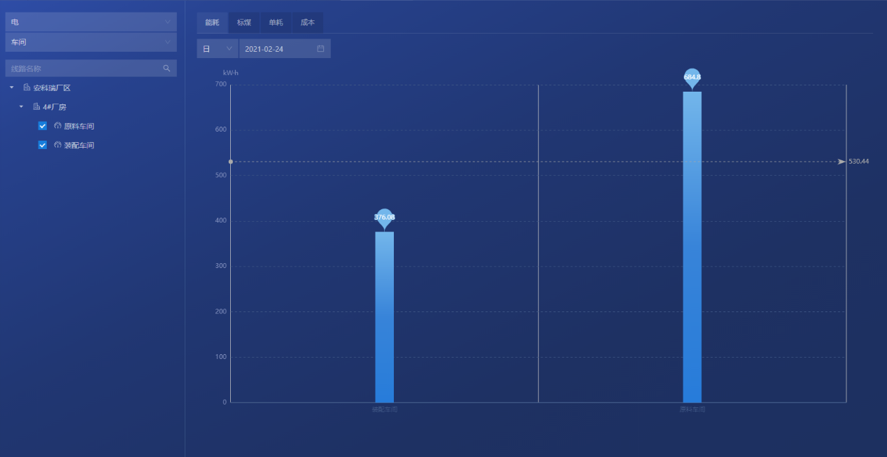 系統(tǒng)對區(qū)域、工段、設(shè)備能源消耗進(jìn)行數(shù)據(jù)采集,監(jiān)測重點(diǎn)設(shè)備及工藝運(yùn)行狀態(tài),如溫度、濕度、流量、壓力、速度等,并支持變配電系統(tǒng)一次運(yùn)行監(jiān)視??芍苯訌膭討B(tài)監(jiān)測平面圖快速瀏覽到所管理的能耗數(shù)據(jù),支持按能源種類、車間、工段、時(shí)間等維度查詢相關(guān)能源用量。