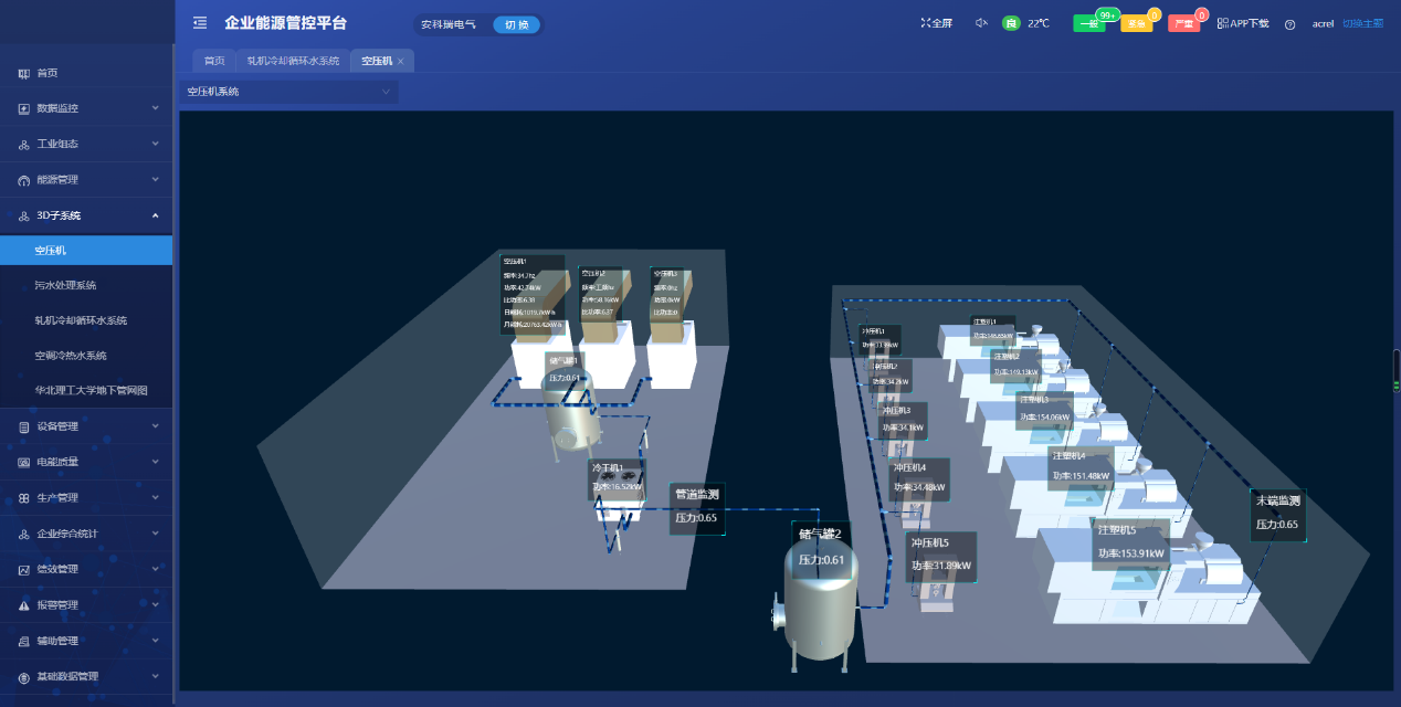 采集廠內(nèi)制冷系統(tǒng)、循環(huán)冷卻水系統(tǒng)、空壓機(jī)系統(tǒng)、污水處理系統(tǒng)等運(yùn)行數(shù)據(jù),可對運(yùn)行能效數(shù)據(jù)、歷史數(shù)據(jù)、實(shí)時(shí)數(shù)據(jù)、累計(jì)電量、功率、分時(shí)段(年、月、周、日)電量及功率進(jìn)行展示對比分析。