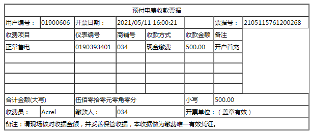 售電、退電、開戶時系統(tǒng)支持三聯(lián)單單據(jù)打印的功能,單據(jù)格式默認(rèn)如下(可以由客戶確認(rèn)后自由定制):